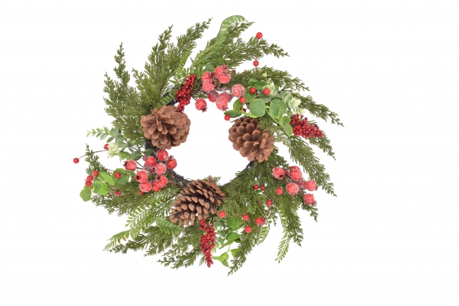 χρ. στεφανι rattan 50cm pe/φυλλα/red berries/pinecones green